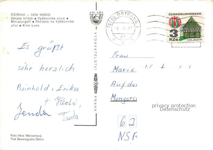 74075368 old postcard OSTRAVA Maehrisch Ostrau CZ Jizni Mesto Detske hriste Vyskovicka ulice Minigolf Fontana na Vyskovicke ulici Kino Luna postalisch gelaufen Erhaltung siehe scans [WerneD78] KatCode: 11520