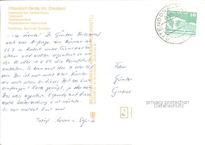 72372252 alte Postkarte Ottendorf-Okrilla Teilansicht mit Zwoelfeckhaus Teichwiesenbad Polytechnische Oberschule postalisch gelaufen Erhaltung siehe scans KatCode: 11110014292415