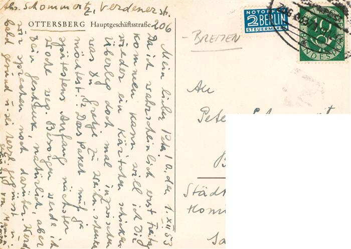 73877970 alte Postkarte Ottersberg Bremen Hauptgeschaeftsstrasse Kirche postalisch gelaufen Bahnpost Erhaltung siehe scans [FriedD77] KatCode: 11110003361008