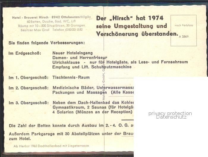 72158221 Ottobeuren Hotel Brauerei Hirsch postalisch nicht gelaufen Erhaltung siehe scans KatCode: 11110009778186