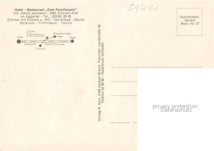 73864001 alte Postkarte Overath Hotel Restaurant Zum Forellenwirt Kegelbahn Gastraum postalisch gelaufen Erhaltung siehe scans [WerneD78] KatCode: 11110005378024