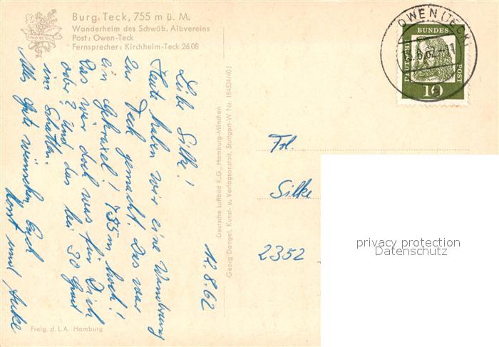 73090251 alte Postkarte Owen Esslingen Burg Teck Fliegeraufnahme postalisch gelaufen Erhaltung siehe scans [PaolaD17] KatCode: 11110008116054