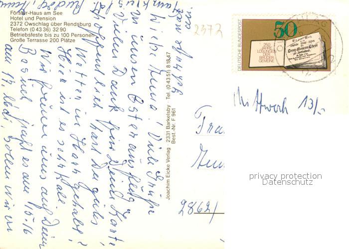 73171274 alte Postkarte Owschlag Foersterhaus am See Hotel Pension Terrasse postalisch gelaufen Erhaltung siehe scans [FriedD77] KatCode: 11110001058127