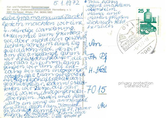 72716949 alte Postkarte Oy Bad Mittelberg Oberallgaeu Bayern Kurheim Ferienheim Sonnenterrasse der ev Diakonieschwesternschaft Herrenberg eV Alpenpanorama postalisch gelaufen Erhaltung siehe scans [FriedD77] KatCode: 11110009780128