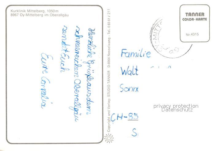72947169 alte Postkarte Oy Bad Mittelberg Oberallgaeu Bayern Kurklinik Mittelberg postalisch gelaufen Erhaltung siehe scans [LiesaD40] KatCode: 11110009780128