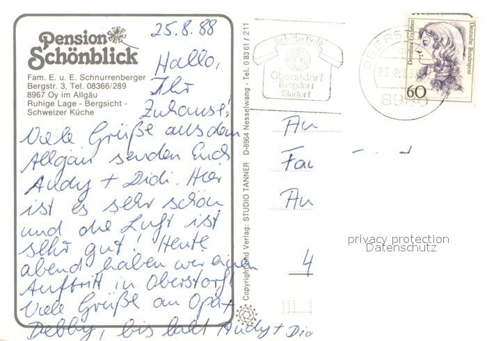 73725921 Oy Bad Mittelberg Oberallgaeu Bayern Pension Schoenblick Landschaftspanorama Alpen Allgaeuer Alpvieh Gruentensee postalisch gelaufen Erhaltung siehe scans [FriedD77] alte Postkarte Frie Katcode 11110009780128