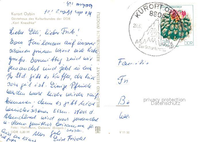 73543833 alte Postkarte Oybin Gaestehaus des Kulturbundes der DDR Karl Kneschke postalisch gelaufen Erhaltung siehe scans [FriedD77] KatCode: 11110014286360