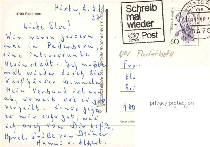 72916916 alte Postkarte Paderborn Alexiuskapelle Dom Rathaus Kaiserpfalz Pader Auf den Dielen Fachwerkhaeuser Westernstrasse Strassencafe postalisch gelaufen Erhaltung siehe scans [FriedD77] KatCode: 11110005774032