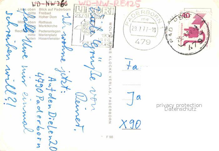 72914724 alte Postkarte Paderborn Stadtpanorama Freibad Dom Rathaus Kirche Paderanlagen Marienplatz Hasenfenster postalisch gelaufen Erhaltung siehe scans [FriedD77] KatCode: 11110005774032
