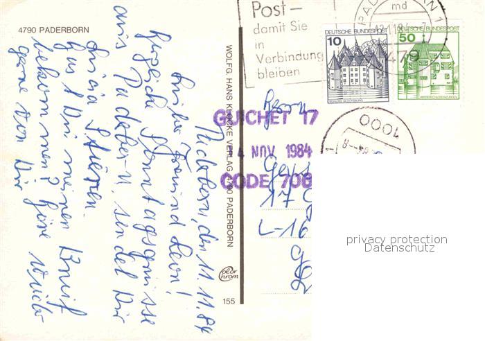 72916919 alte Postkarte Paderborn Westernstrasse Fussgaengerzone Liboriberg Marienplatz Rathaus Dom Museum Westerntor Brunnen Padequelle Halle postalisch gelaufen Erhaltung siehe scans [FriedD77] KatCode: 11110005774032