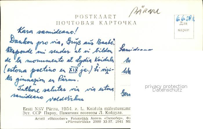 Paernu Denkmal L. Koidula postalisch nicht gelaufen Erhaltung siehe scans