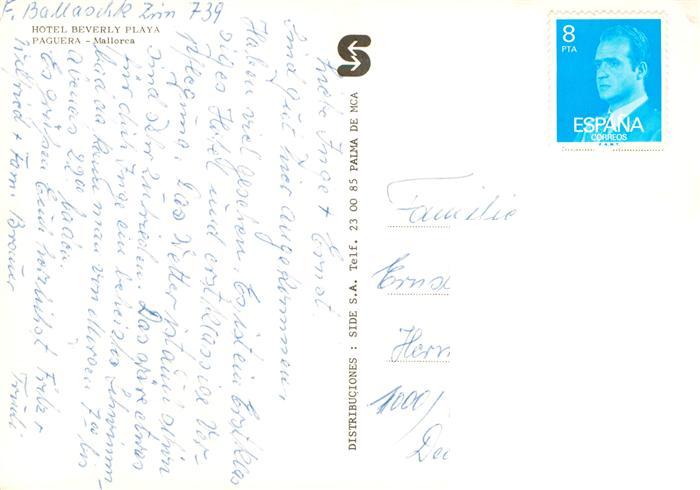 73905556 old postcard Paguera Mallorca Islas Baleares ES Hotel Beverly Playa Fliegeraufnahme postalisch gelaufen Erhaltung siehe scans [WerneD78] KatCode: 11510