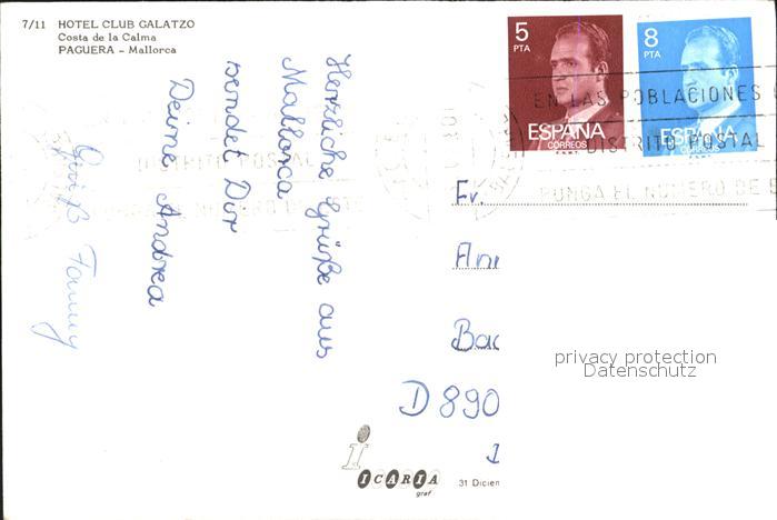 old postcard Paguera Mallorca Islas Baleares Hotel Club Galatzo Swimming Pool Restaurant Terrasse postalisch gelaufen Erhaltung siehe scans