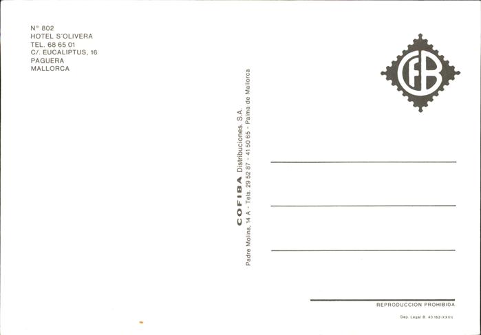Paguera Mallorca Islas Baleares Hotel s Olivera Piscina Playa postalisch nicht gelaufen Erhaltung siehe scans