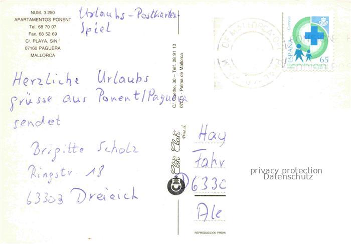 74110150 old postcard Paguera Peguera Calvia Mallorca ES Apartamentos Ponent Hotel Strand postalisch gelaufen Erhaltung siehe scans [IrynaD87] KatCode: 11510