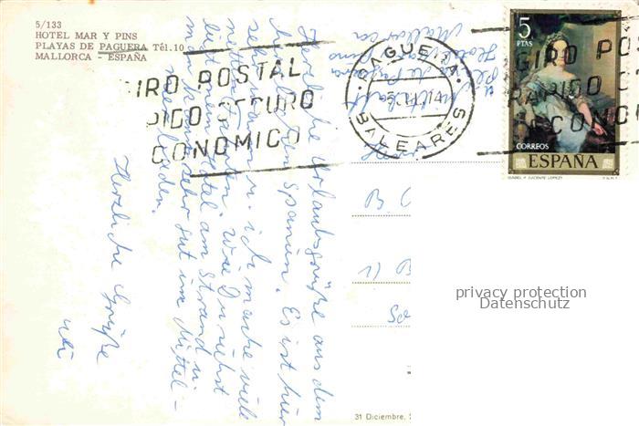 74143484 old postcard Paguera Peguera Calvia Mallorca ES Hotel Mar y Pins postalisch gelaufen Erhaltung siehe scans [SanaeD93] KatCode: 11510