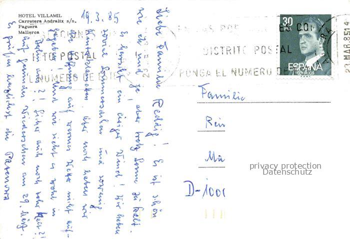 74092439 old postcard Paguera Peguera Calvia Mallorca ES Hotel Villamil postalisch gelaufen Erhaltung siehe scans [WerneD78] KatCode: 11510