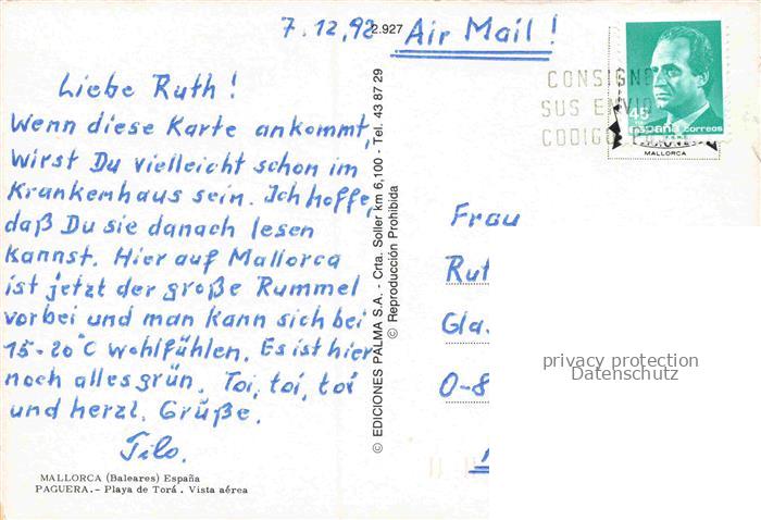 74144187 old postcard Paguera Peguera Calvia Mallorca ES Strand Playa de Tora postalisch gelaufen Fliegeraufnahme Erhaltung siehe scans [SanaeD93] KatCode: 11510