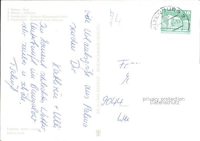72373070 alte Postkarte Pahna Fockendorf Naherholungszentrum Bad Zeltplatz Konsum Stausee Gaststaette Badestrand postalisch gelaufen Erhaltung siehe scans KatCode: 11110016077005