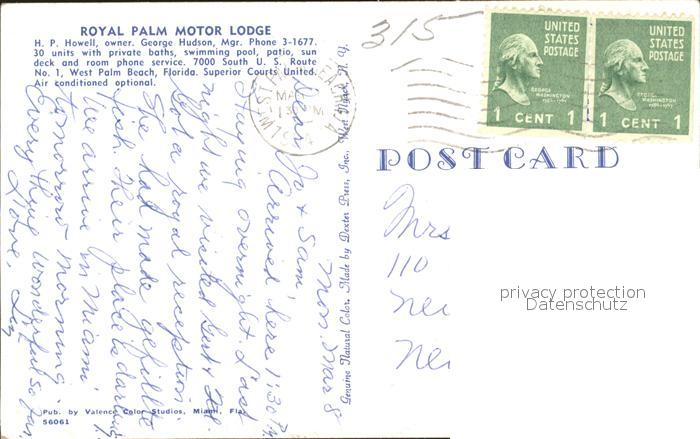 72368911 old postcard Palm Beach Royal Palm Motor Lodge Swimming Pool postalisch gelaufen Erhaltung siehe scans KatCode: 14140110000000