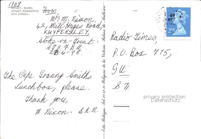 old postcard Palma de Mallorca Apart. Bahia Sorrento Sta Ponsa postalisch gelaufen Erhaltung siehe scans