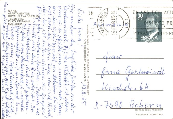 old postcard Palma de Mallorca Apartamentos Royal Playa de Palma Hallenbad postalisch gelaufen Erhaltung siehe scans