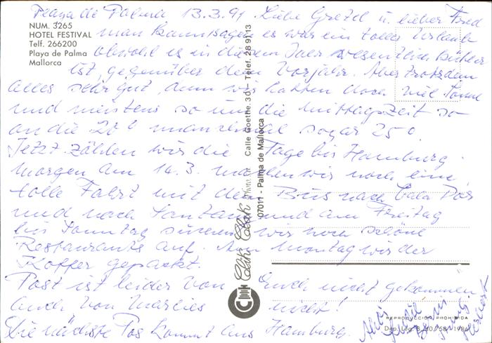 Palma de Mallorca Hotel Festival Playa de Palma postalisch nicht gelaufen Erhaltung siehe scans