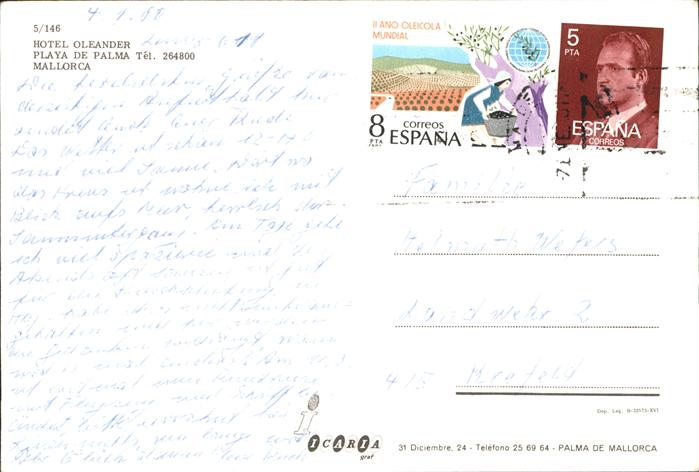 old postcard Palma de Mallorca Hotel Oleander Playa de Palma piscina postalisch gelaufen Erhaltung siehe scans