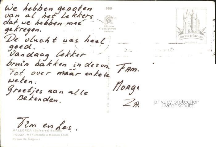 old postcard Palma de Mallorca Monumento a Ramon Liull postalisch gelaufen Erhaltung siehe scans
