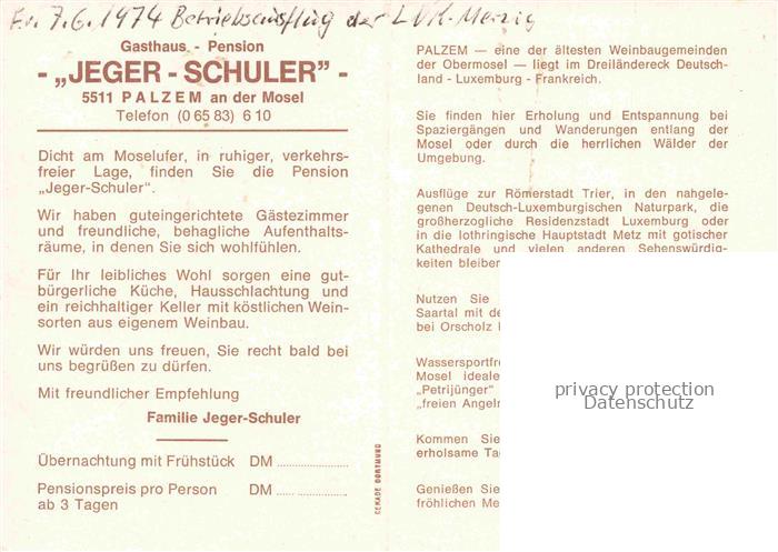 74053424 Palzem Gasthaus Pension Jeger-Schuler Gastraum Terrasse Moselblick postalisch nicht gelaufen Werbekarte (keine Postkarte) Erhaltung siehe scans [FriedD77] KatCode: 11110007235104