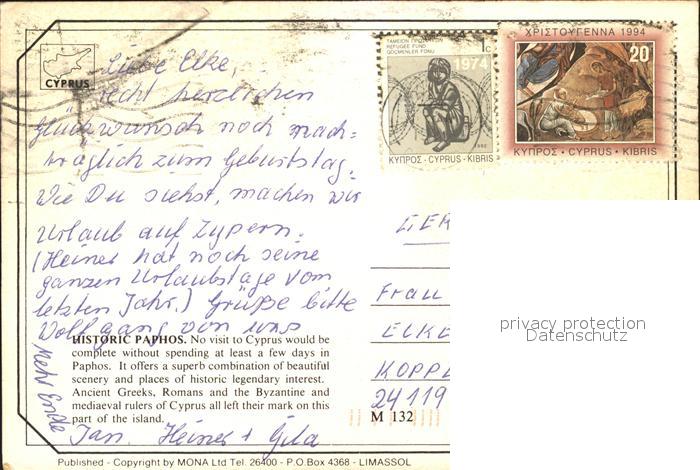 alte Postkarte Paphos Pelikane Mosaik Strand Hafen postalisch gelaufen Erhaltung siehe scans