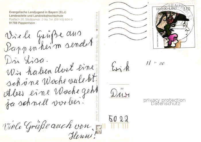 72782735 alte Postkarte Pappenheim Mittelfranken Ev Landjugend in Bayern ELJ Landesstelle Landvolkshochschule postalisch gelaufen Erhaltung siehe scans [FriedD77] KatCode: 11110009577158