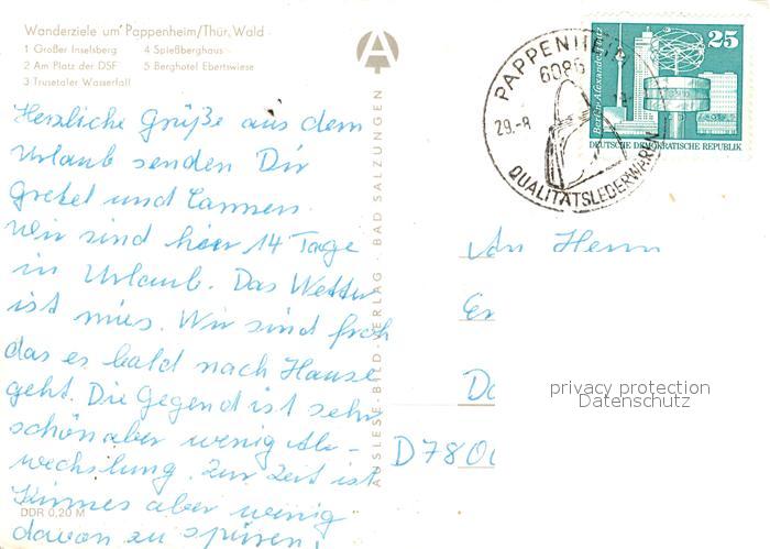 73480426 alte Postkarte Pappenheim Thueringen Grosser Inselsberg Platz DSF Trusetaler Wasserfall Berghotel postalisch gelaufen Erhaltung siehe scans [KathaD81] KatCode: 11110016066023