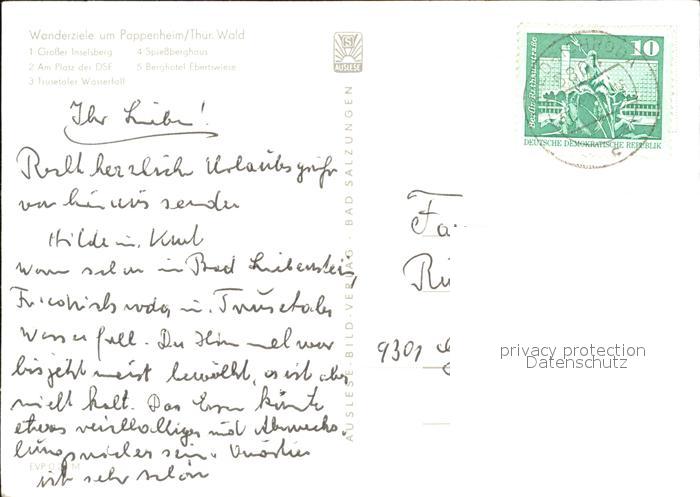 72514409 alte Postkarte Pappenheim Thueringen Wanderziele Inselsberg Spiessberghaus Trusetaler-Wasserfall postalisch gelaufen Erhaltung siehe scans KatCode: 11110016066023