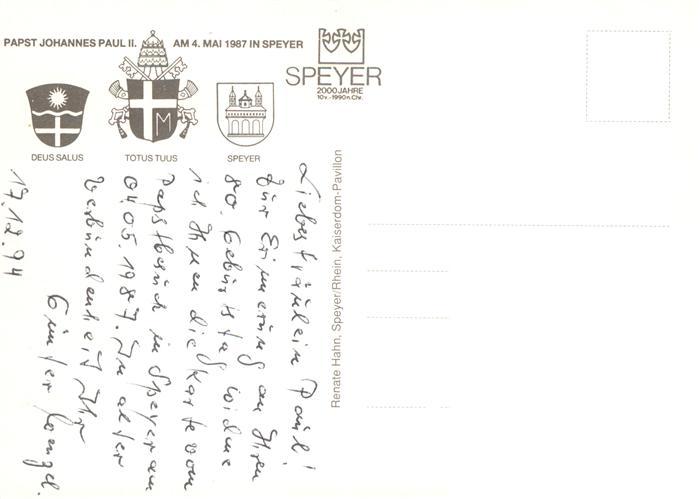 alte Postkarte Papst Pope Pape Johannes Paul 2 Kaiserdom Speyer postalisch gelaufen Erhaltung siehe scans [IrynaD87]