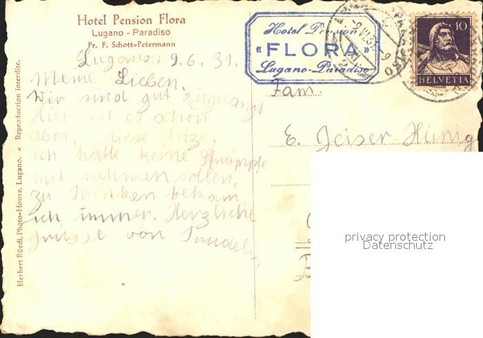 11643871 alte Postkarte Paradiso TI Hotel Pension Flora postalisch gelaufen Erhaltung siehe scans KatCode: 11470210660200