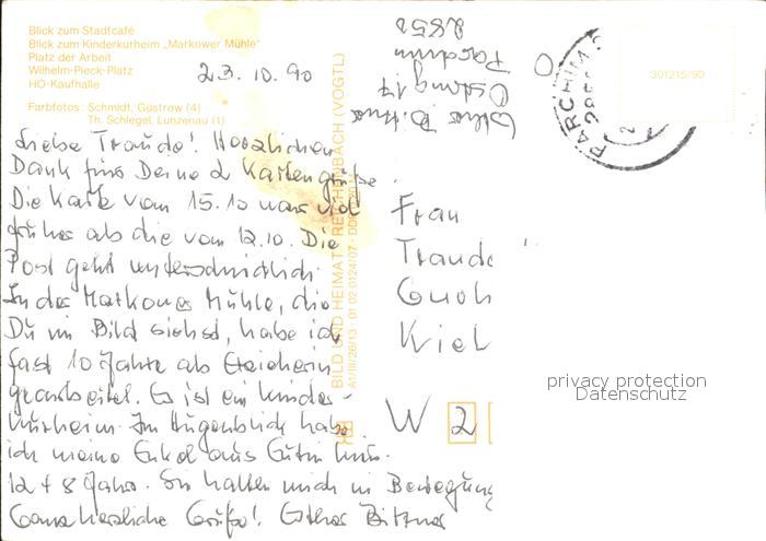 72331425 alte Postkarte Parchim Mecklenburg-Vorpommern Stadtcafe Kinderkurheim Markower Muehle Wilhelm-Pieck-Platz postalisch gelaufen Erhaltung siehe scans KatCode: 11110013060056