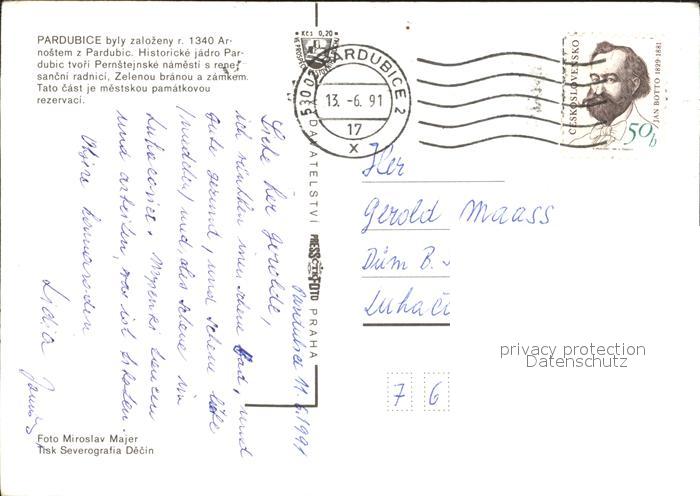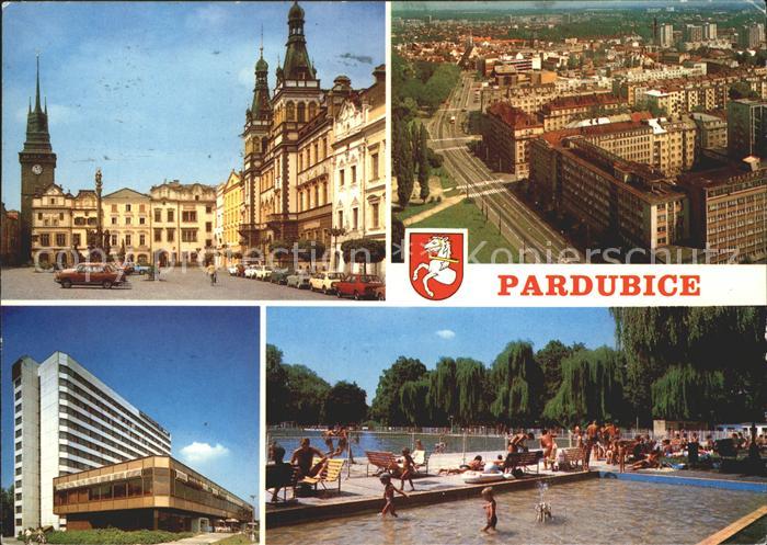 old postcard Pardubice Pardubitz Marktplatz Rathaus Hochhaus Freibad postalisch gelaufen Erhaltung siehe scans
