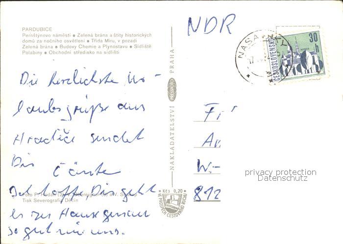 old postcard Pardubice Pardubitz Pernstynovo namesti Zelena brana a stity historickych domu za nochiho sovetleni Trida Miru Budovy Chemie Sidliste Polabiny Obchodni stredisko na sidlisti postalisch gelaufen Erhaltung siehe scans