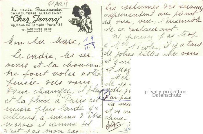 34146232 PARIS 75 Chez Jenny Brasserie Alsacienne Costumes Kuenstlerkarte postalisch nicht gelaufen Erhaltung siehe scans [FriedD77] KatCode: 11170075175056