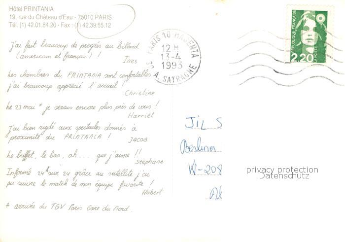 13792684 Paris 75 Hotel Printania Restaurant Billard postalisch gelaufen Erhaltung siehe scans [FriedD77] carte postale Frie Katcode 11170075175056