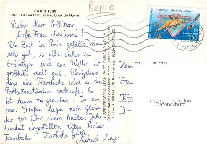 12821176 carte postale Paris Bahnhof Sankt Lazare postalisch gelaufen Reprokarte (modern) Erhaltung siehe scans [AndreD76] KatCode: 11170075175056