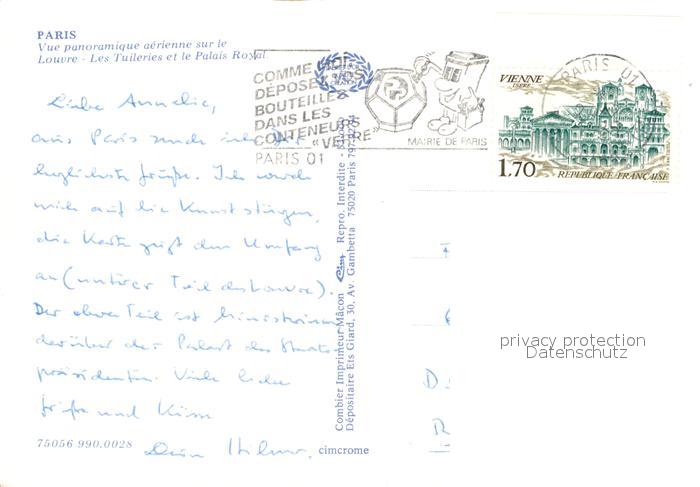 13052514 carte postale Paris Fliegeraufnahme Louvre Tuileries Palais Royal postalisch gelaufen Erhaltung siehe scans [NatalD47] KatCode: 11170075175056