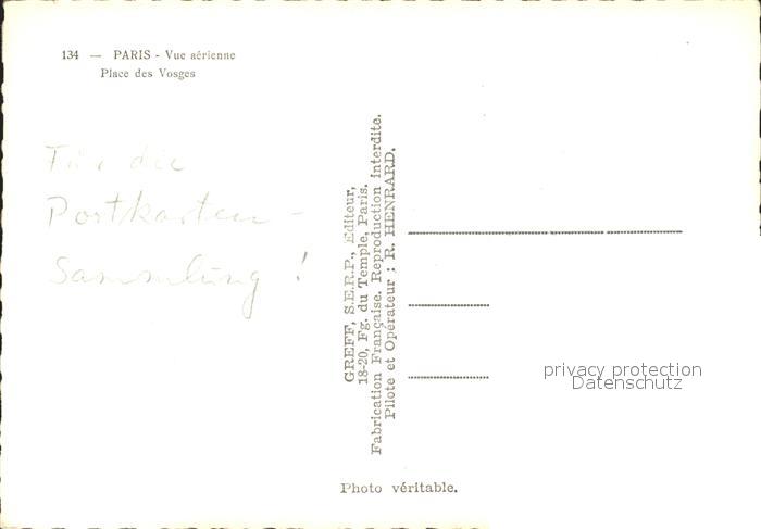 12318642 Paris Fliegeraufnahme Place des Vosges postalisch nicht gelaufen Erhaltung siehe scans KatCode: 11170075175056