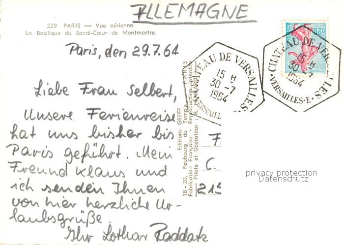 13225144 carte postale Paris Fliegeraufnahme Sacre Coeur de Montmartre postalisch gelaufen Erhaltung siehe scans [KathaD81] KatCode: 11170075175056