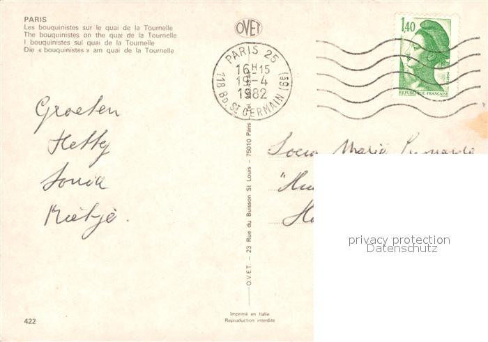 12957050 carte postale Paris Les bouquinistes sur le quai de la Tournelle postalisch gelaufen Erhaltung siehe scans [FriedD77] KatCode: 11170075175056