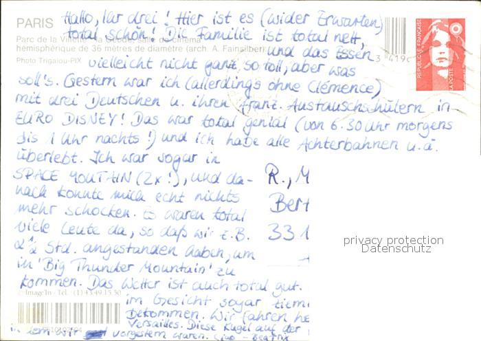 12317336 carte postale Paris Parc de Villette Geode postalisch gelaufen Erhaltung siehe scans KatCode: 11170075175056