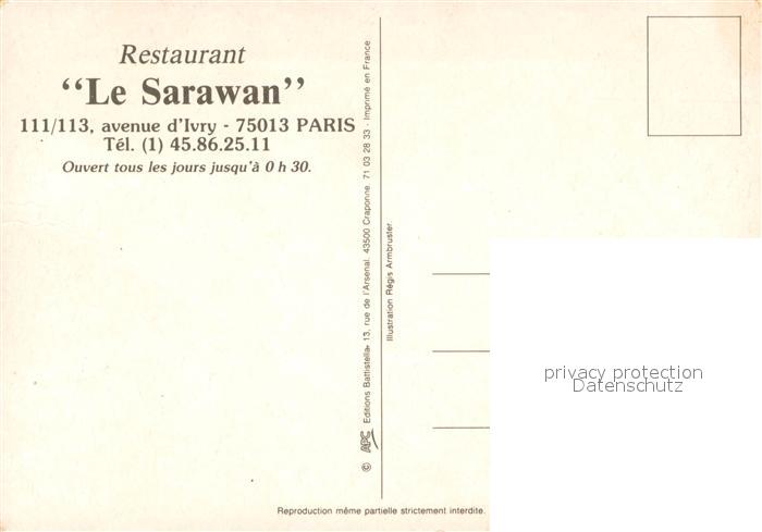 13631080 Paris Restaurant Le Sarawan Kuenstlerkarte postalisch nicht gelaufen Erhaltung siehe scans [FriedD77] Frie Katcode 11170075175056