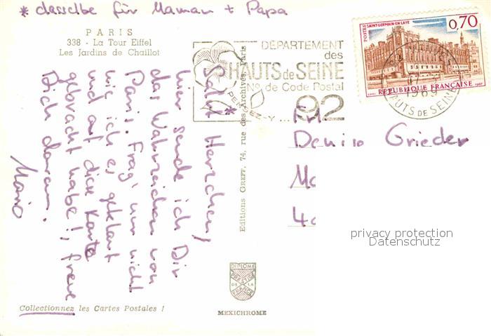 12766130 carte postale Paris Tour Eiffel les Jardins de Chaillot postalisch gelaufen Erhaltung siehe scans [LiesaD40] KatCode: 11170075175056