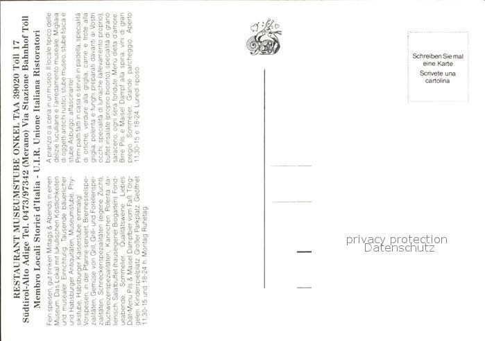 Partschins Parcines Restaurant Museumstube Onkel Taa Bad Egart postalisch nicht gelaufen Erhaltung siehe scans